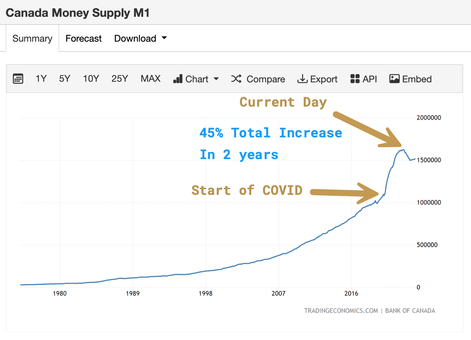 Canada’s M1 Money Supply, tracked over 25 years.