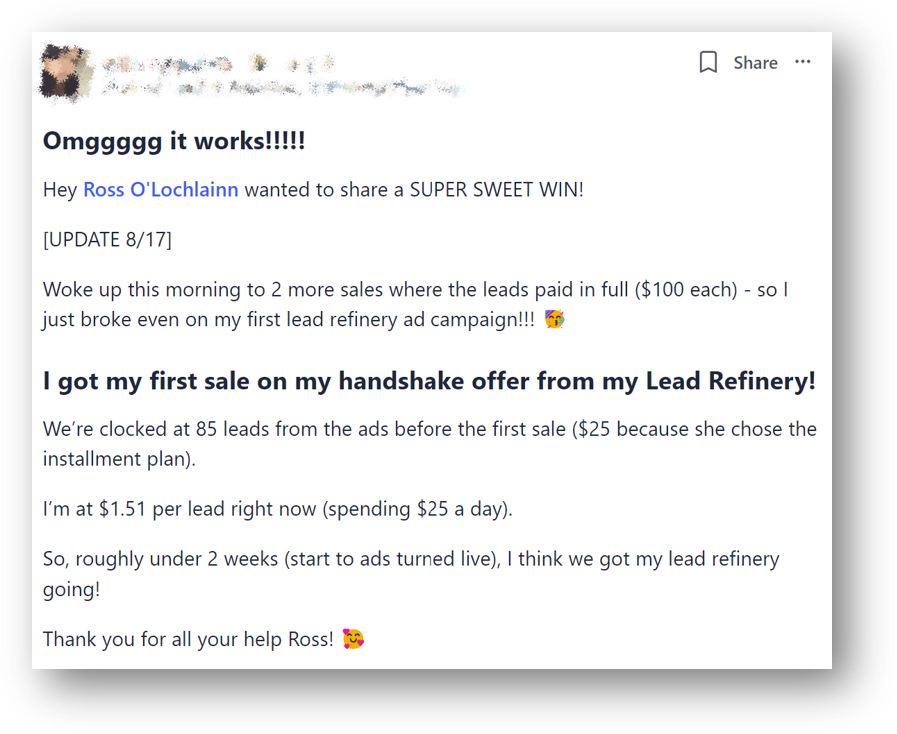 Below you’ll find a list of stories from clients that have used my Lead Refinery training, to illustrate that some people are having success with this method.